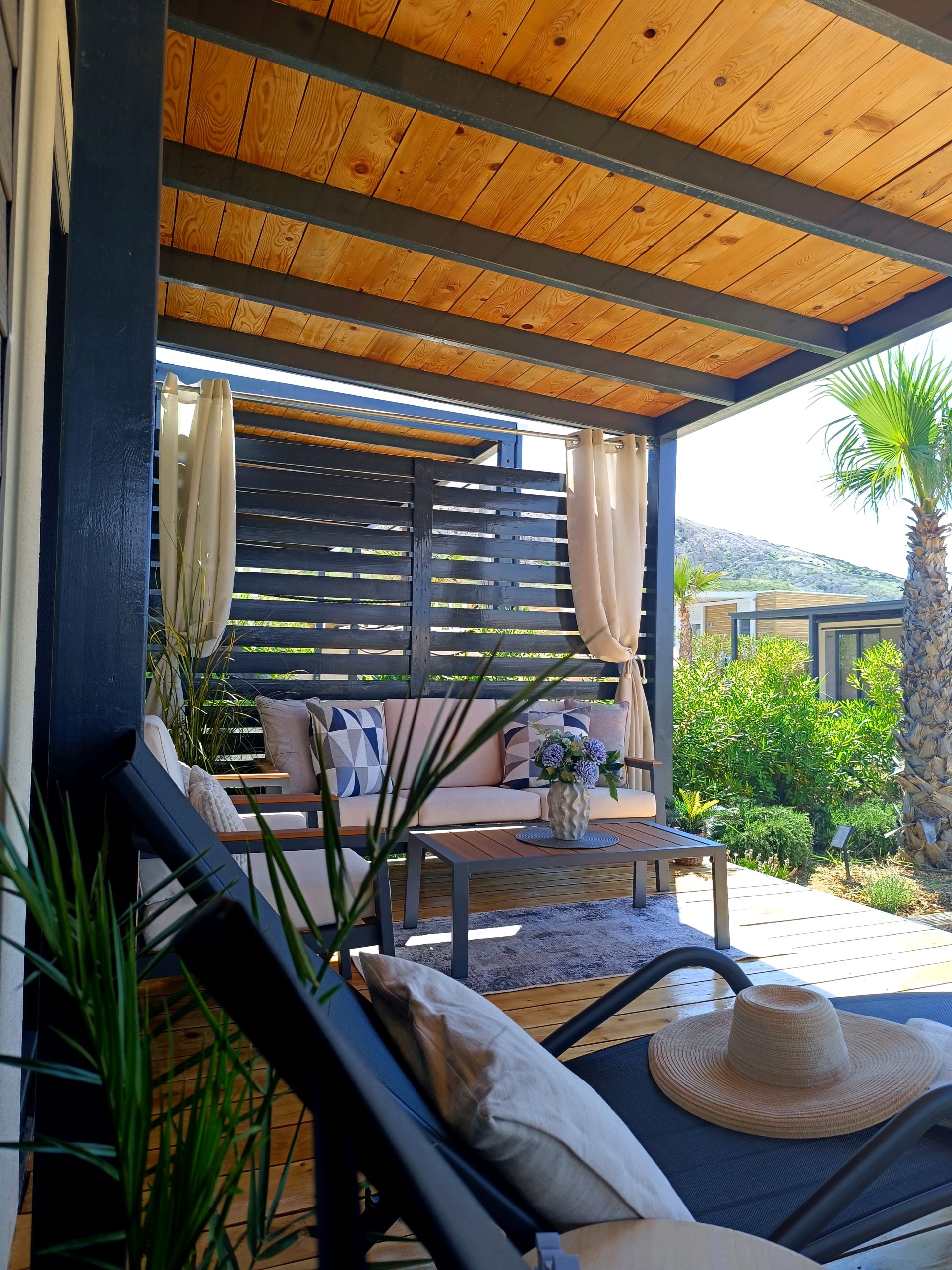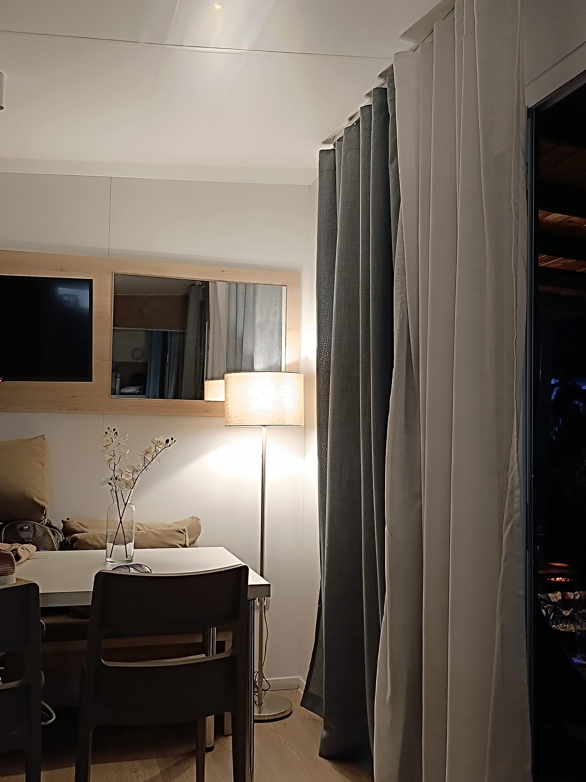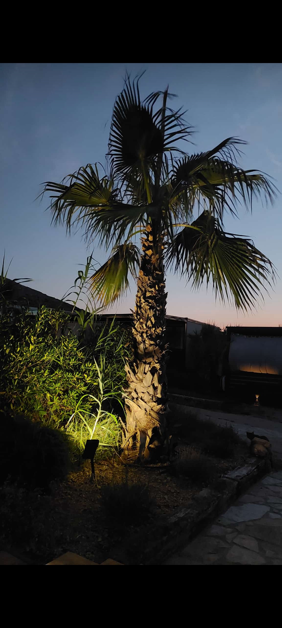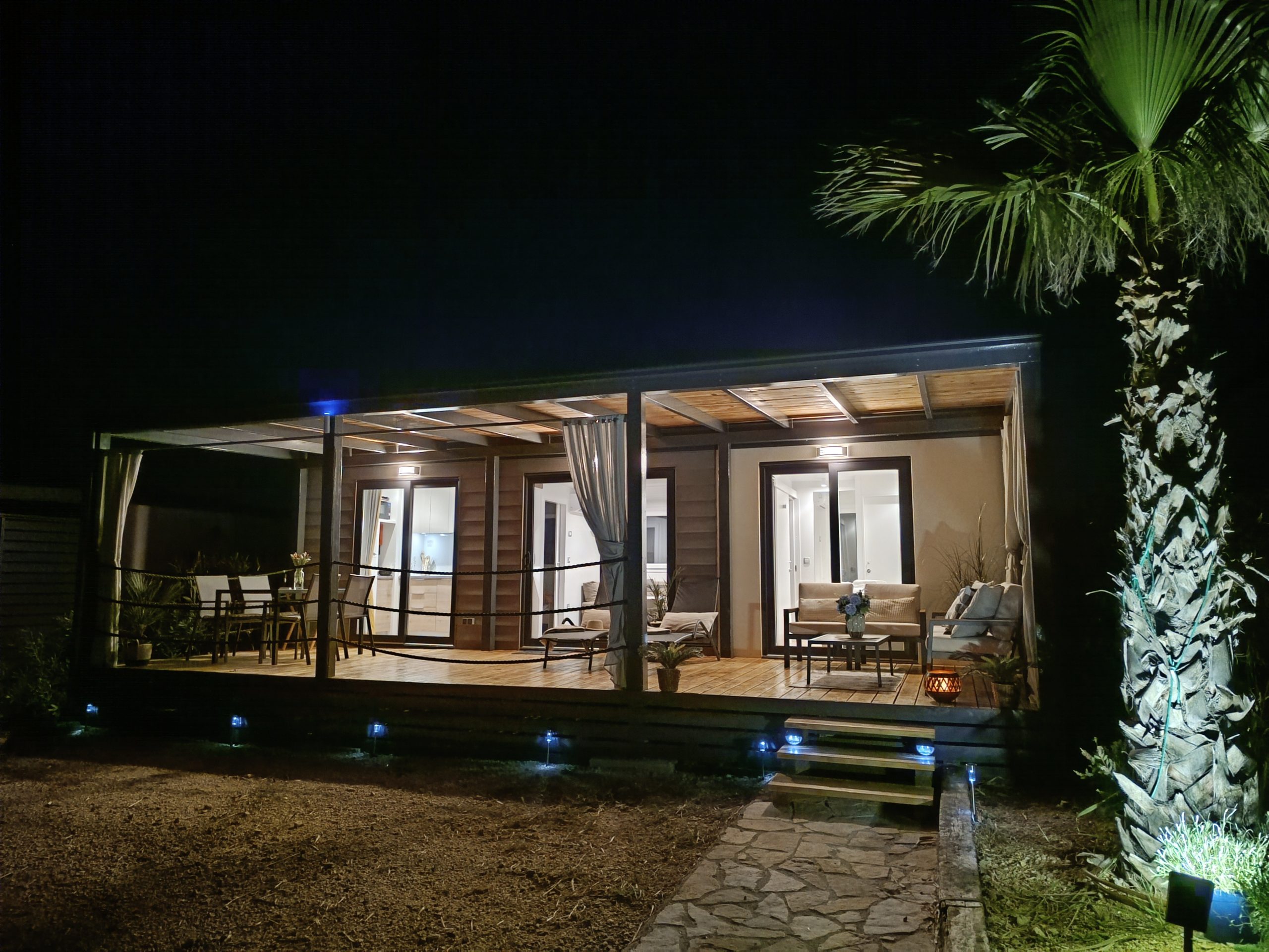 Evening view of a stylishly lit terrace with curtains and tropical plants at Zen Zone holiday home in Croatia