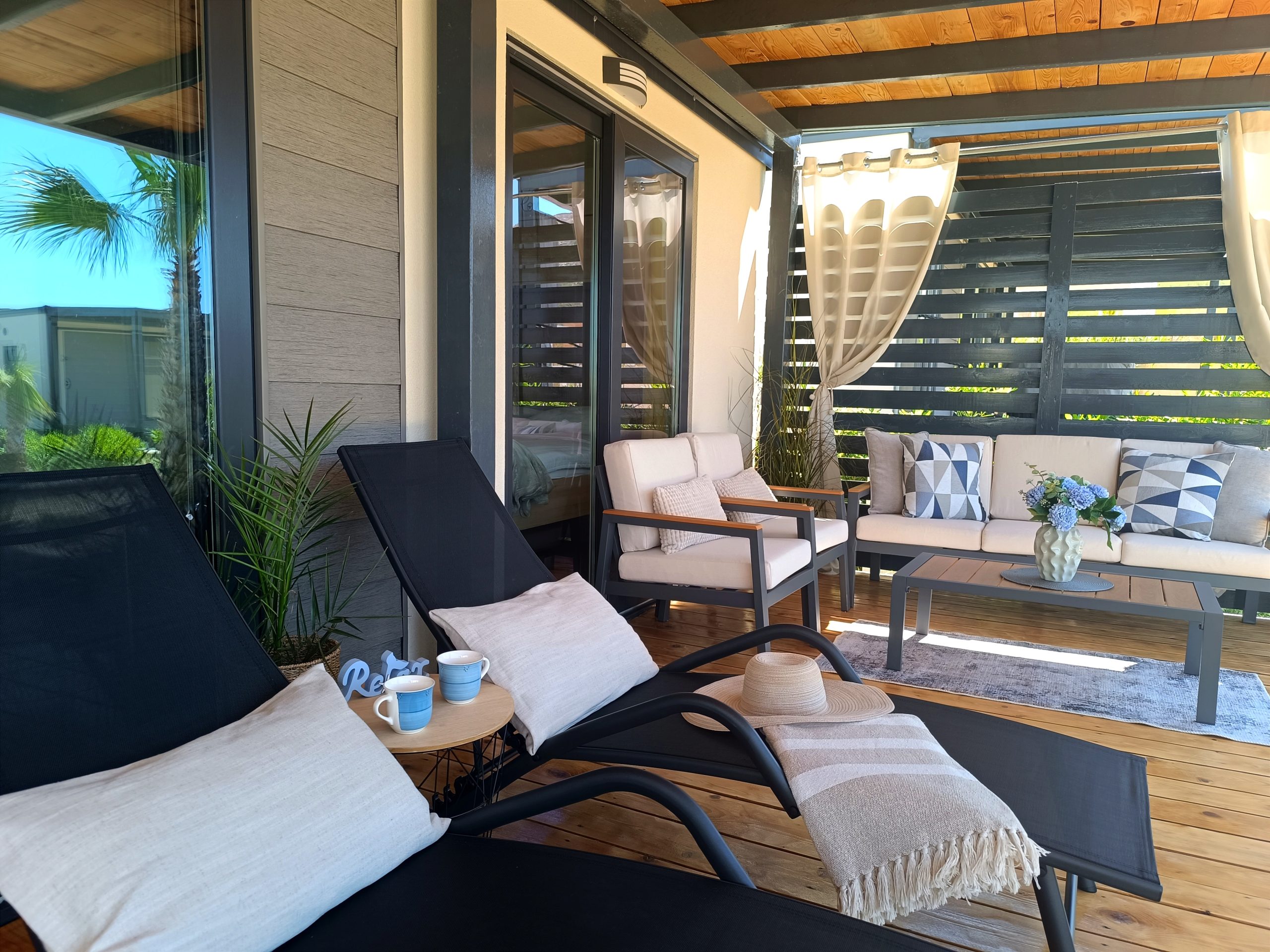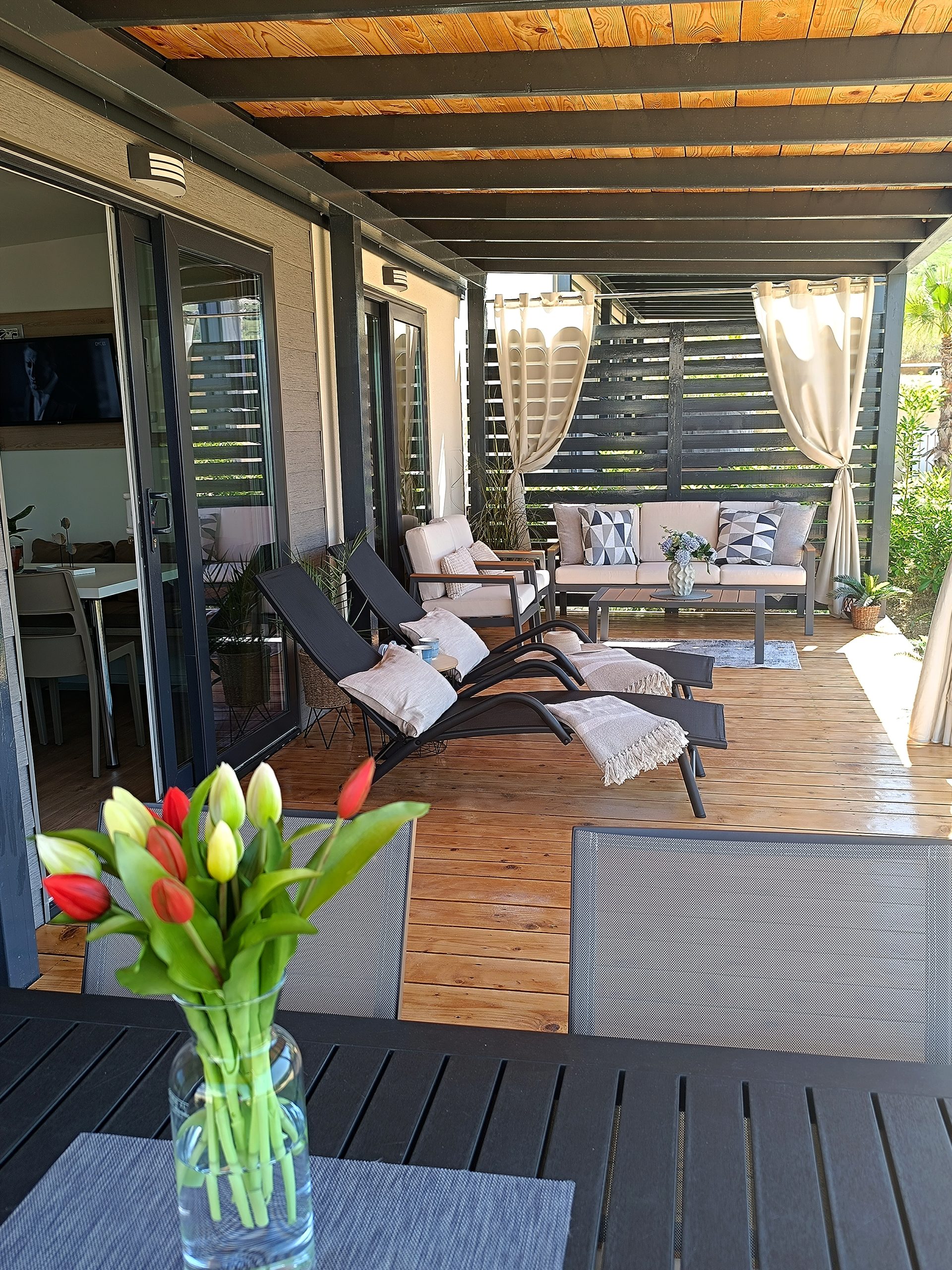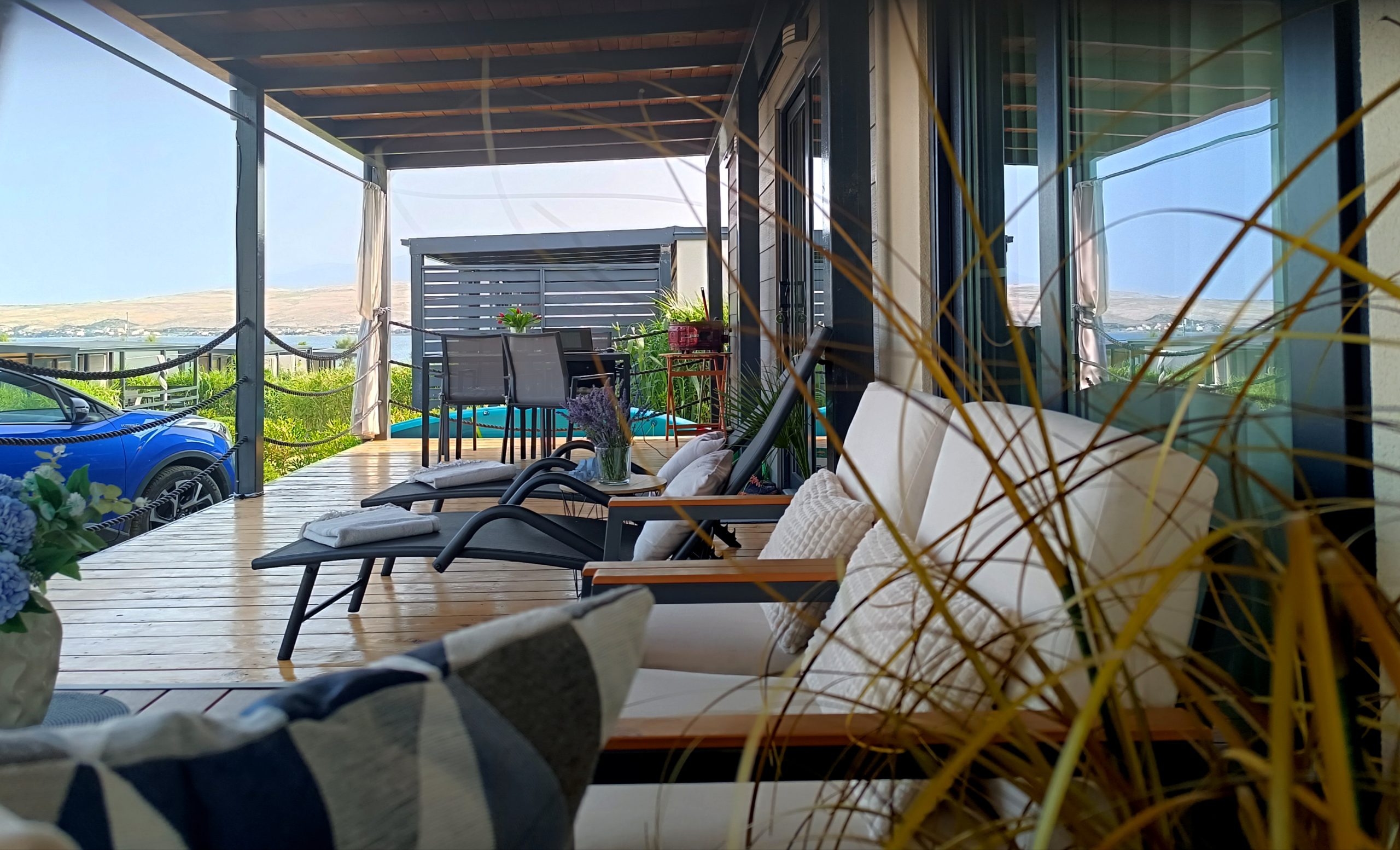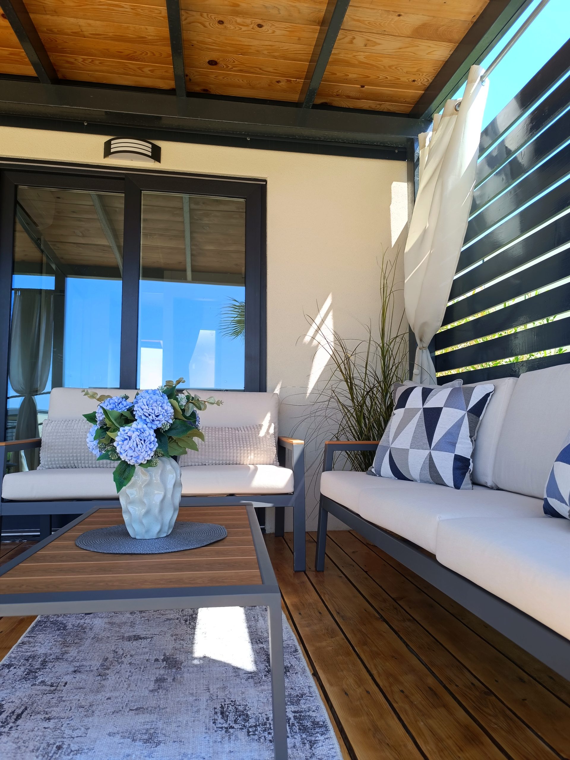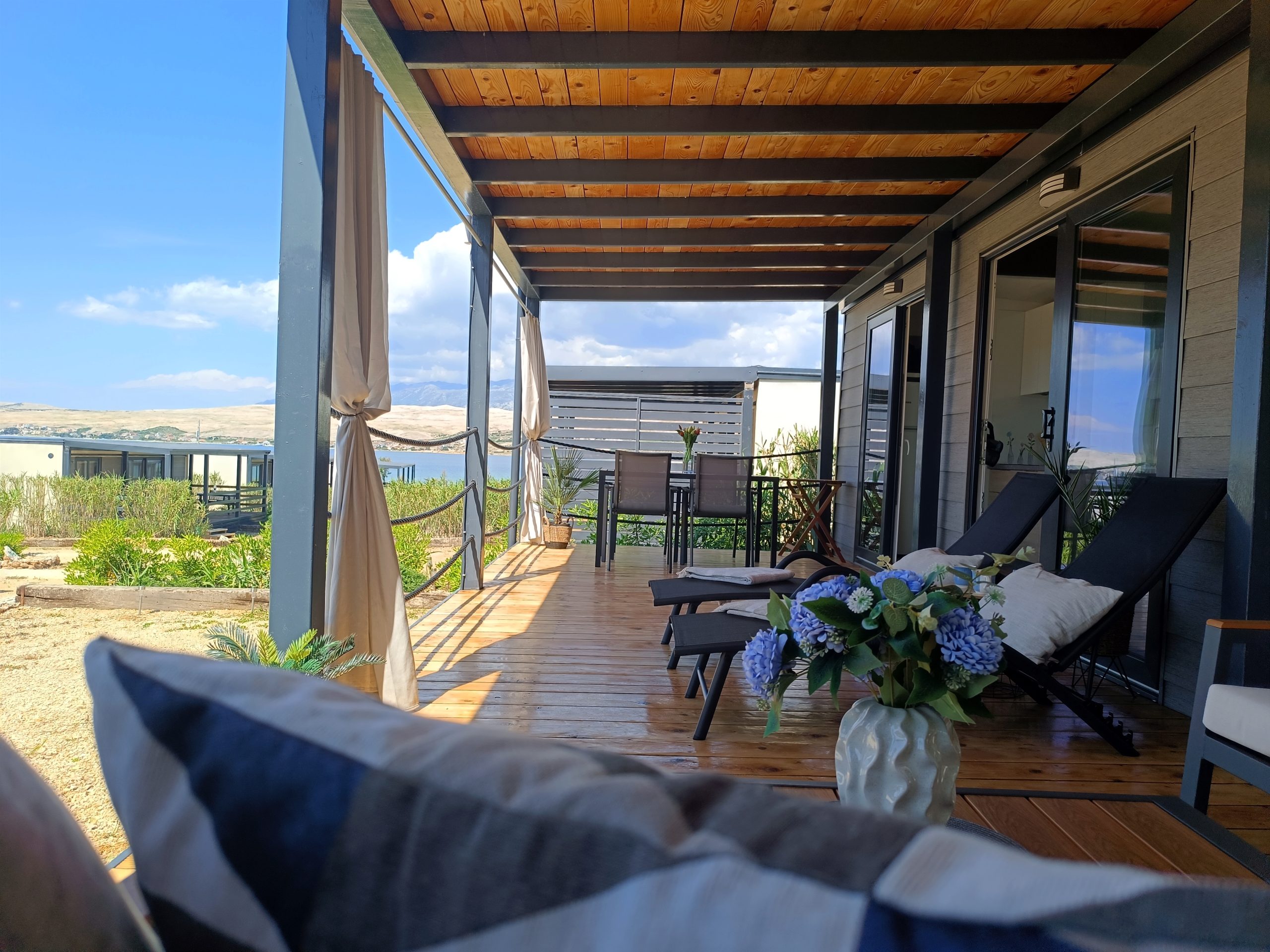 Evening view of a stylishly lit terrace with curtains and tropical plants at Zen Zone holiday home in Croatia