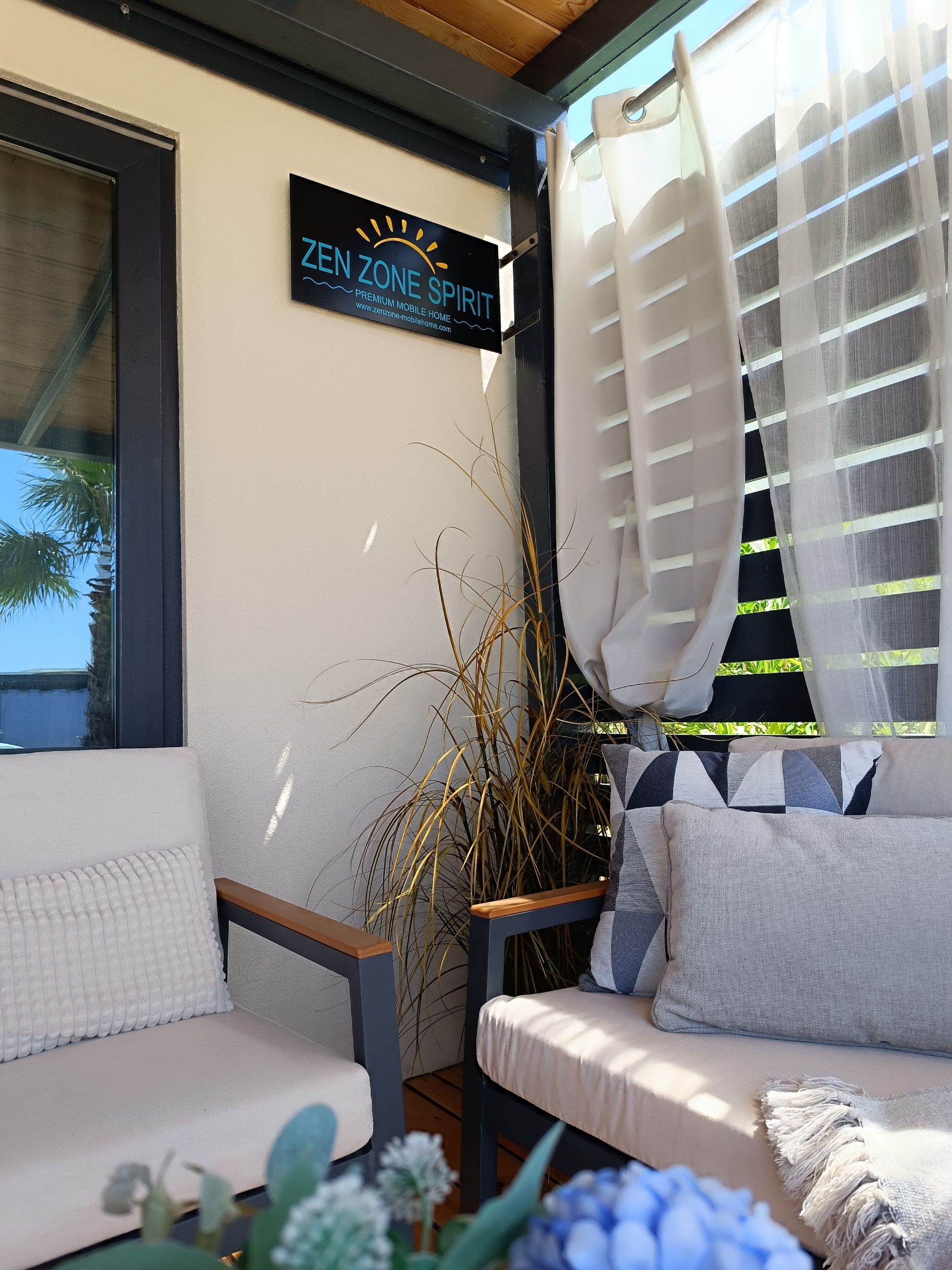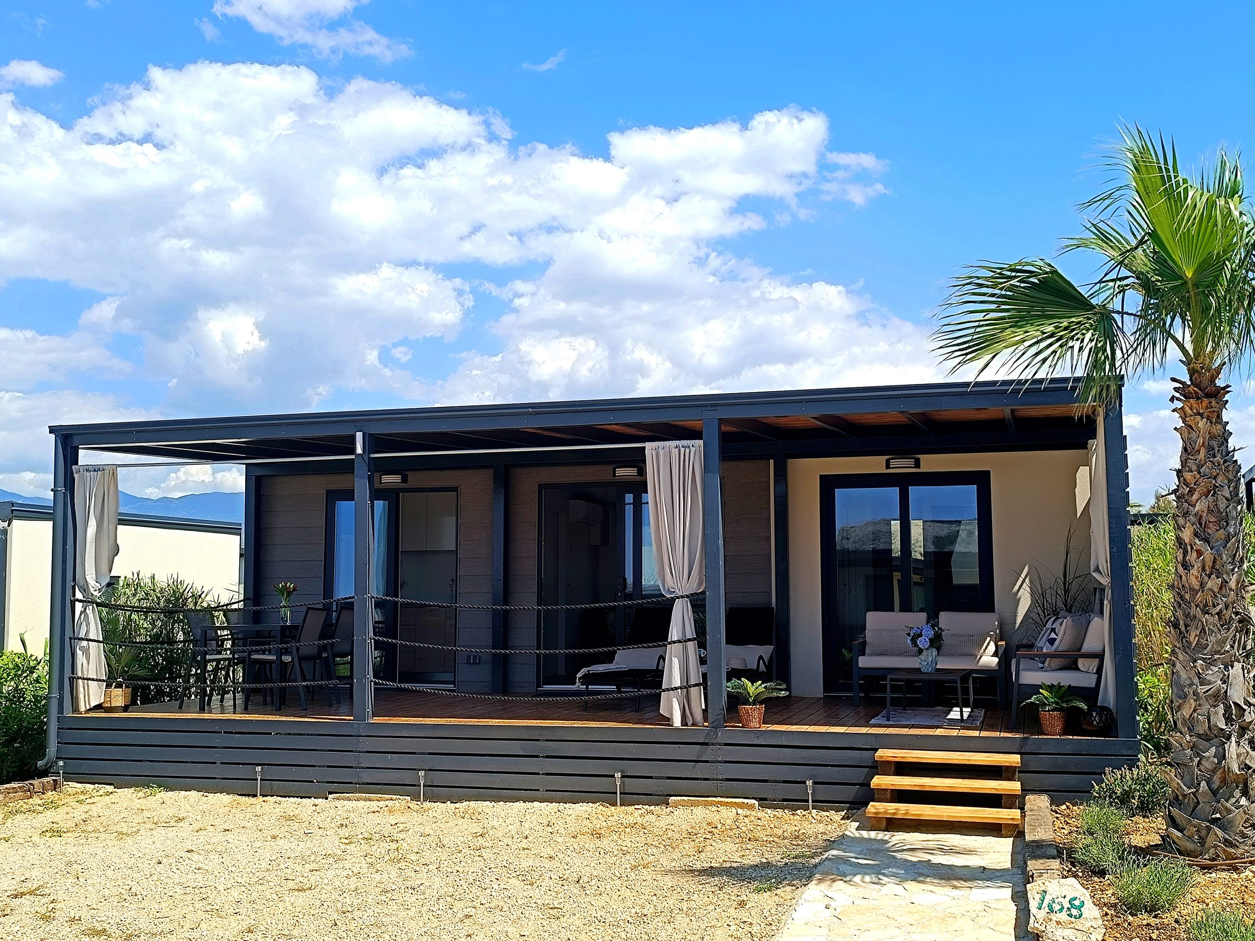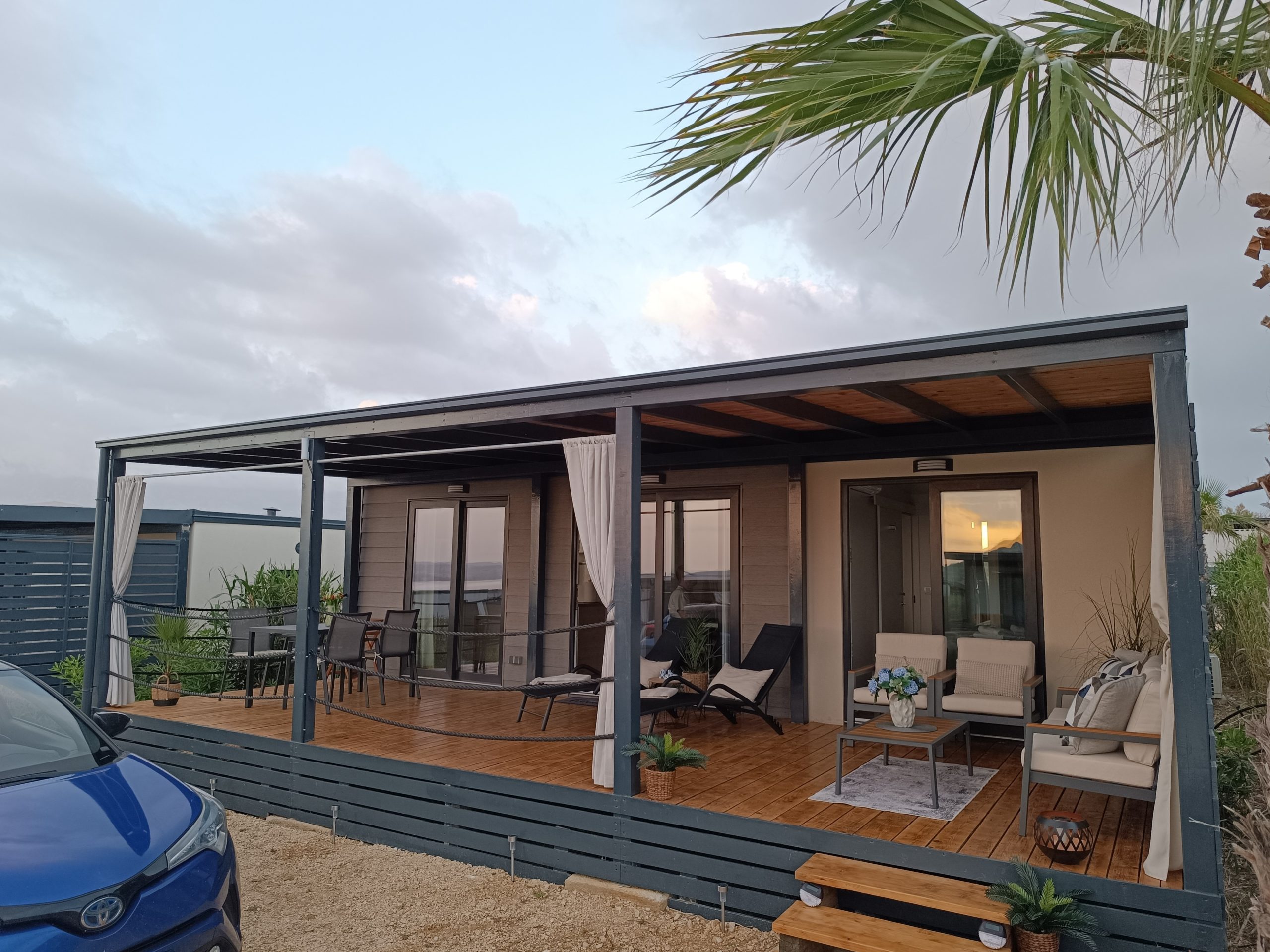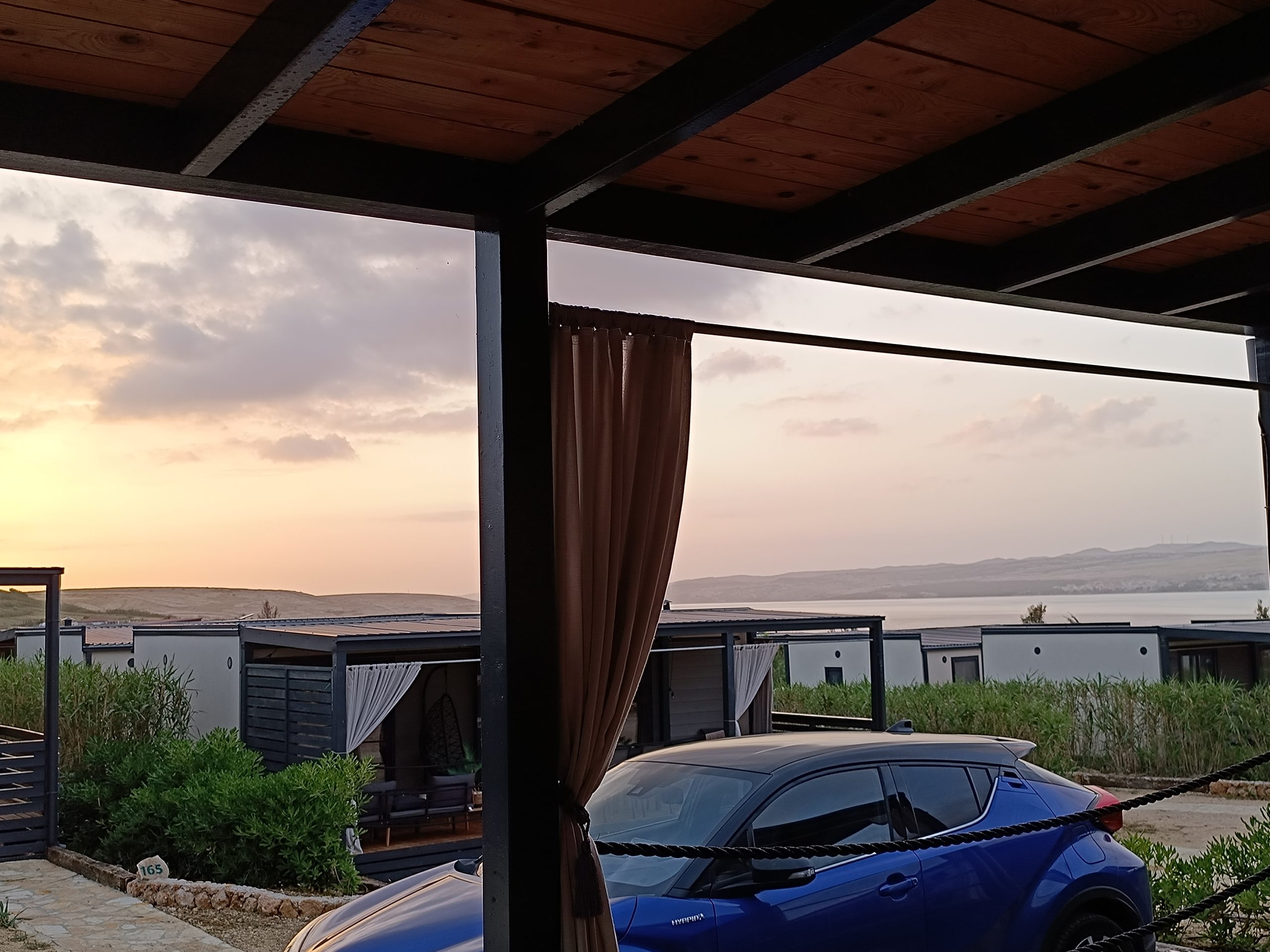 Evening view of a stylishly lit terrace with curtains and tropical plants at Zen Zone holiday home in Croatia