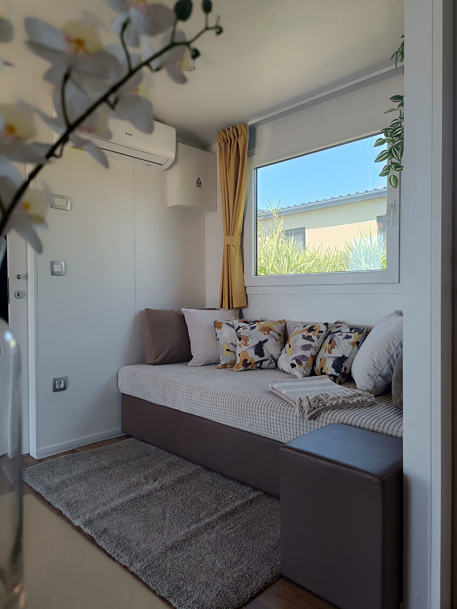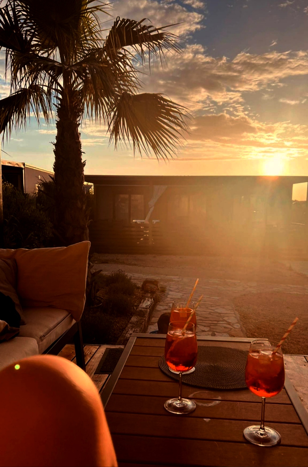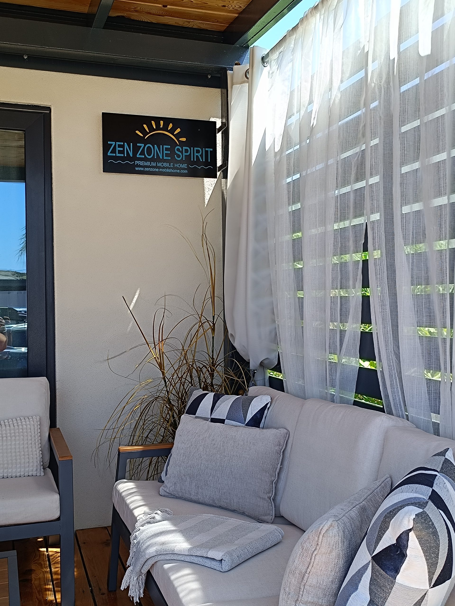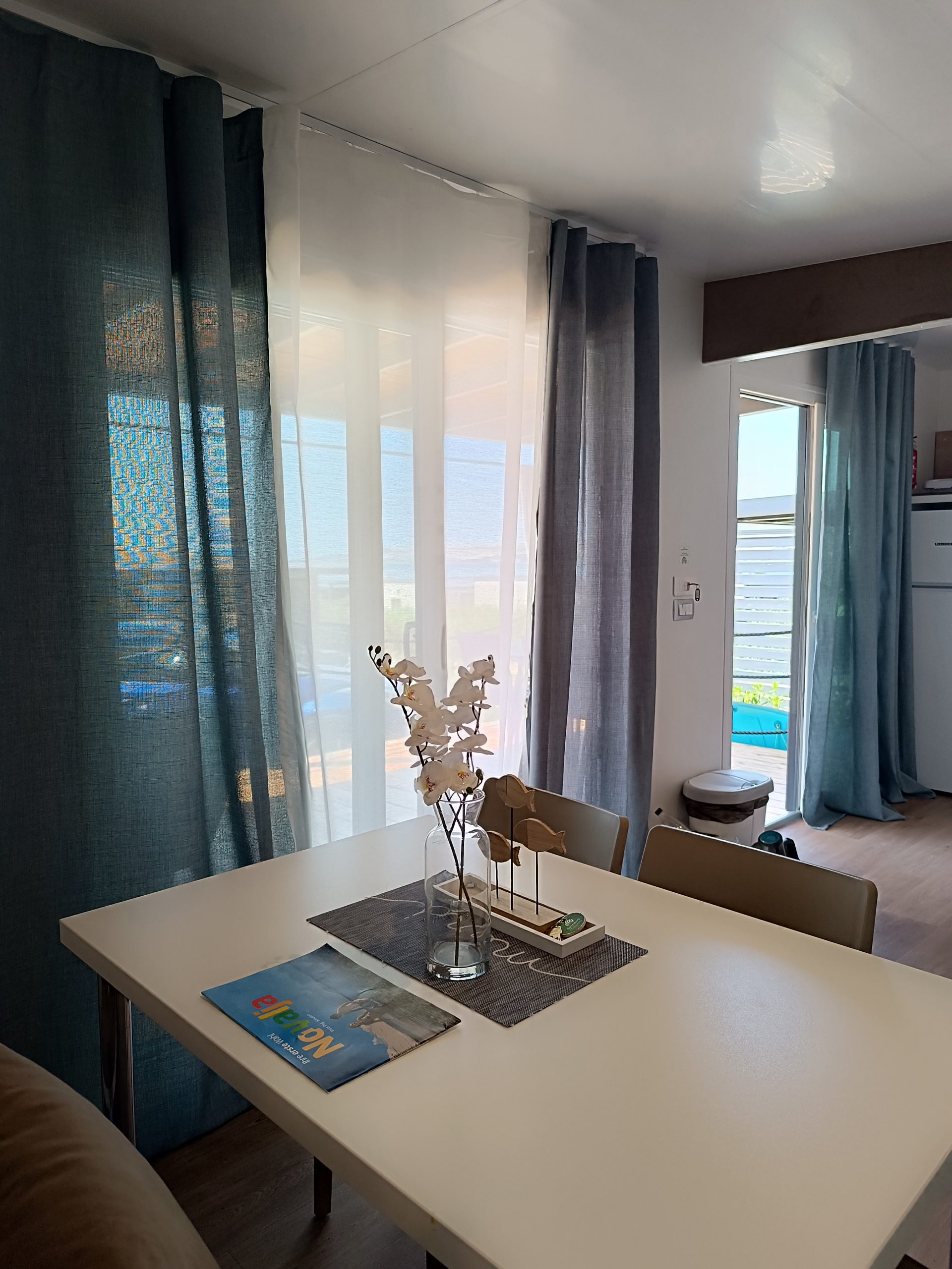 Evening view of a stylishly lit terrace with curtains and tropical plants at Zen Zone holiday home in Croatia
