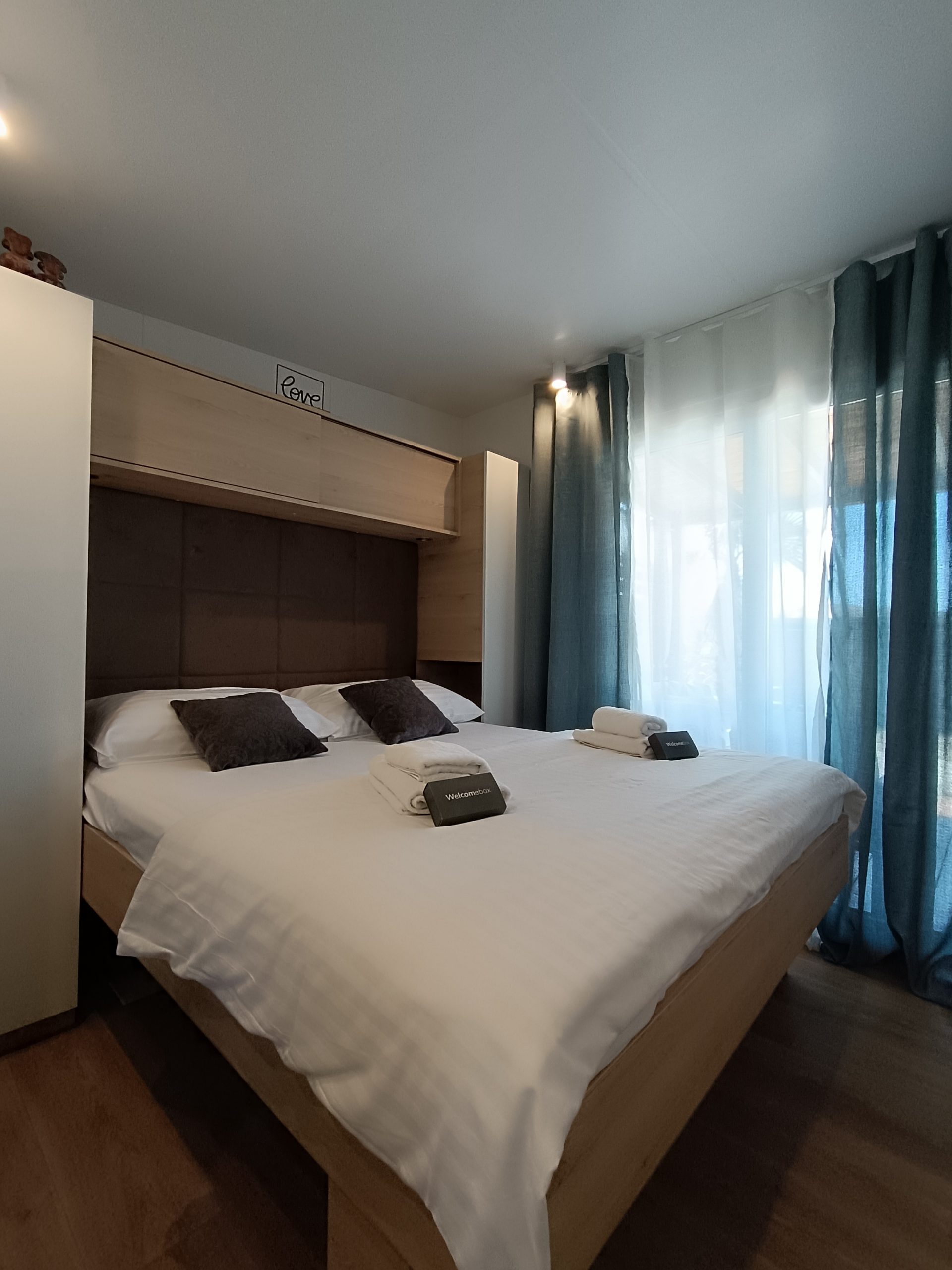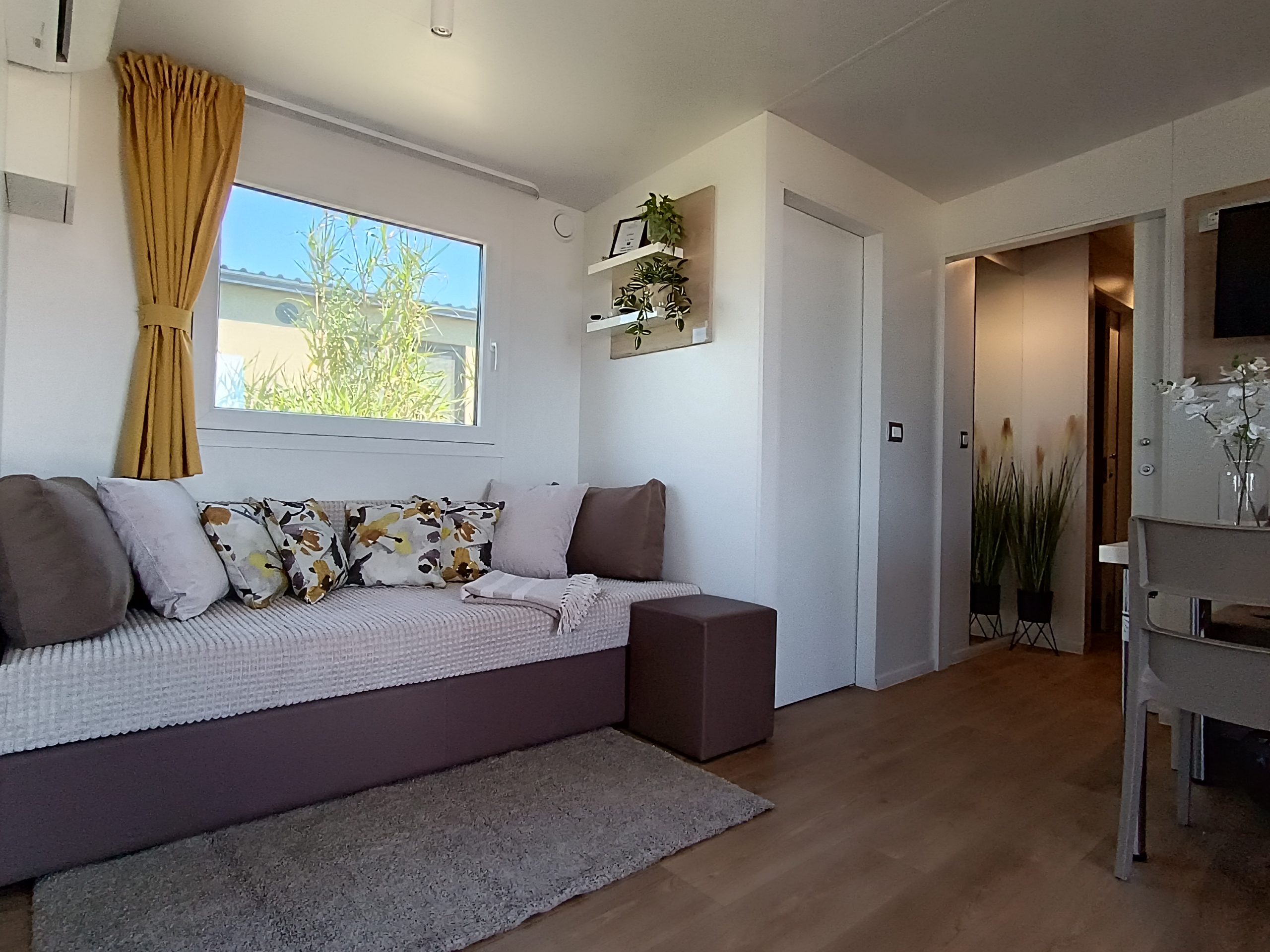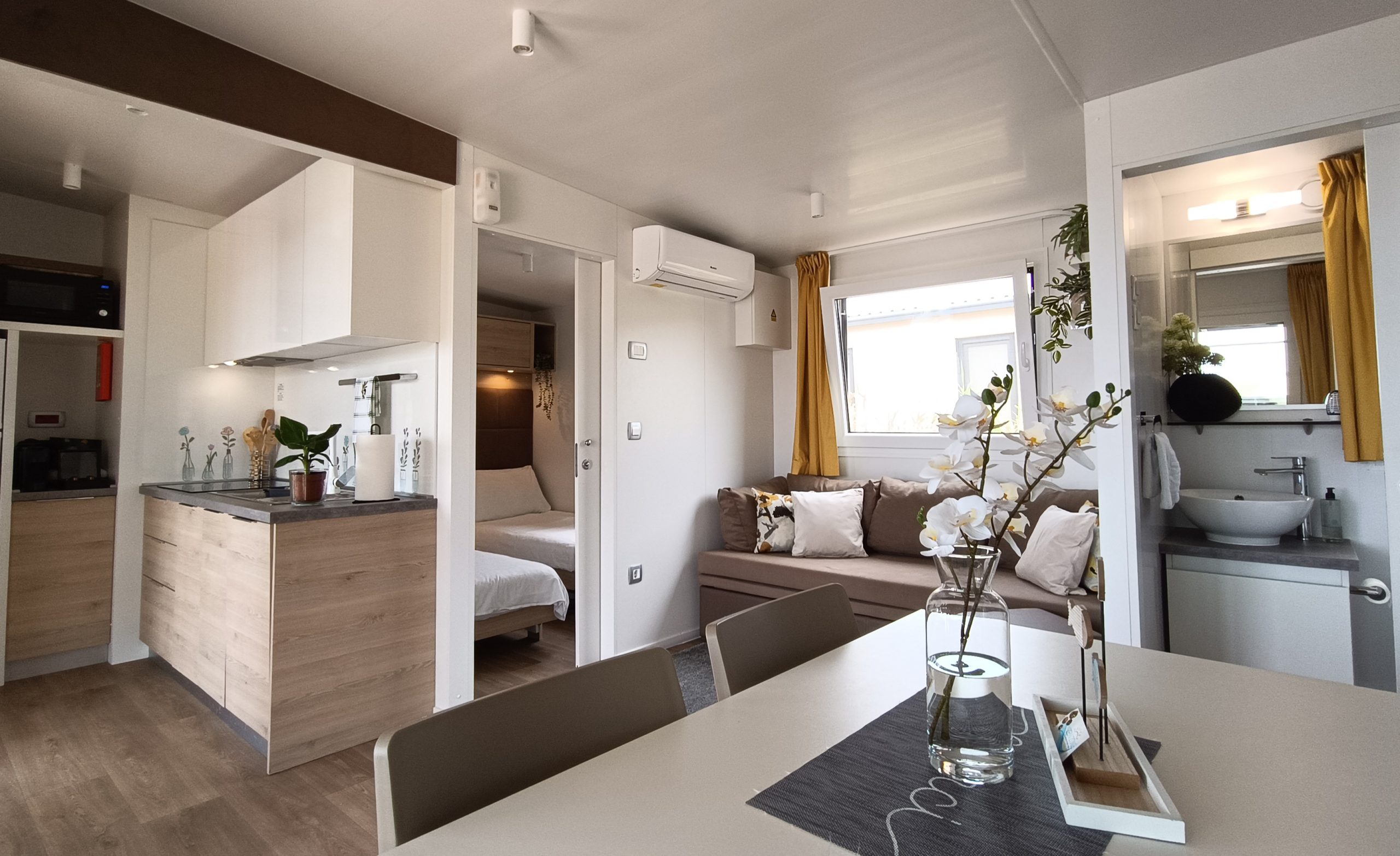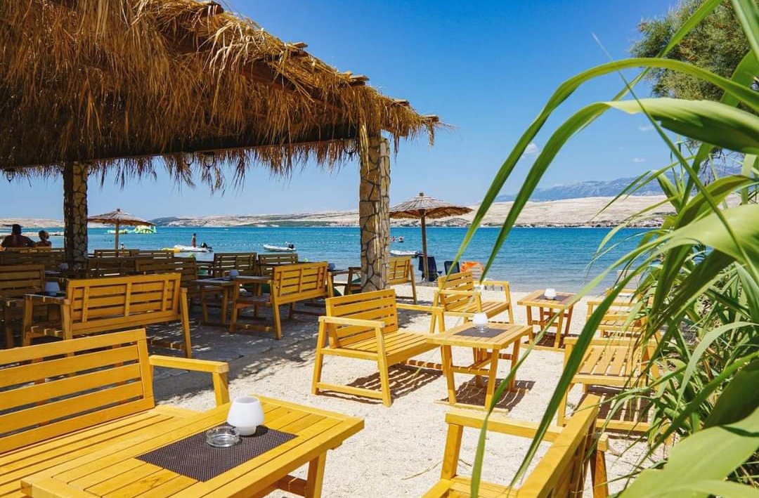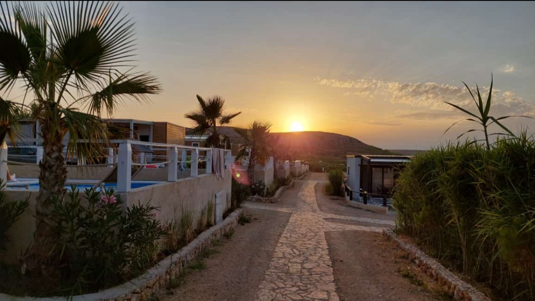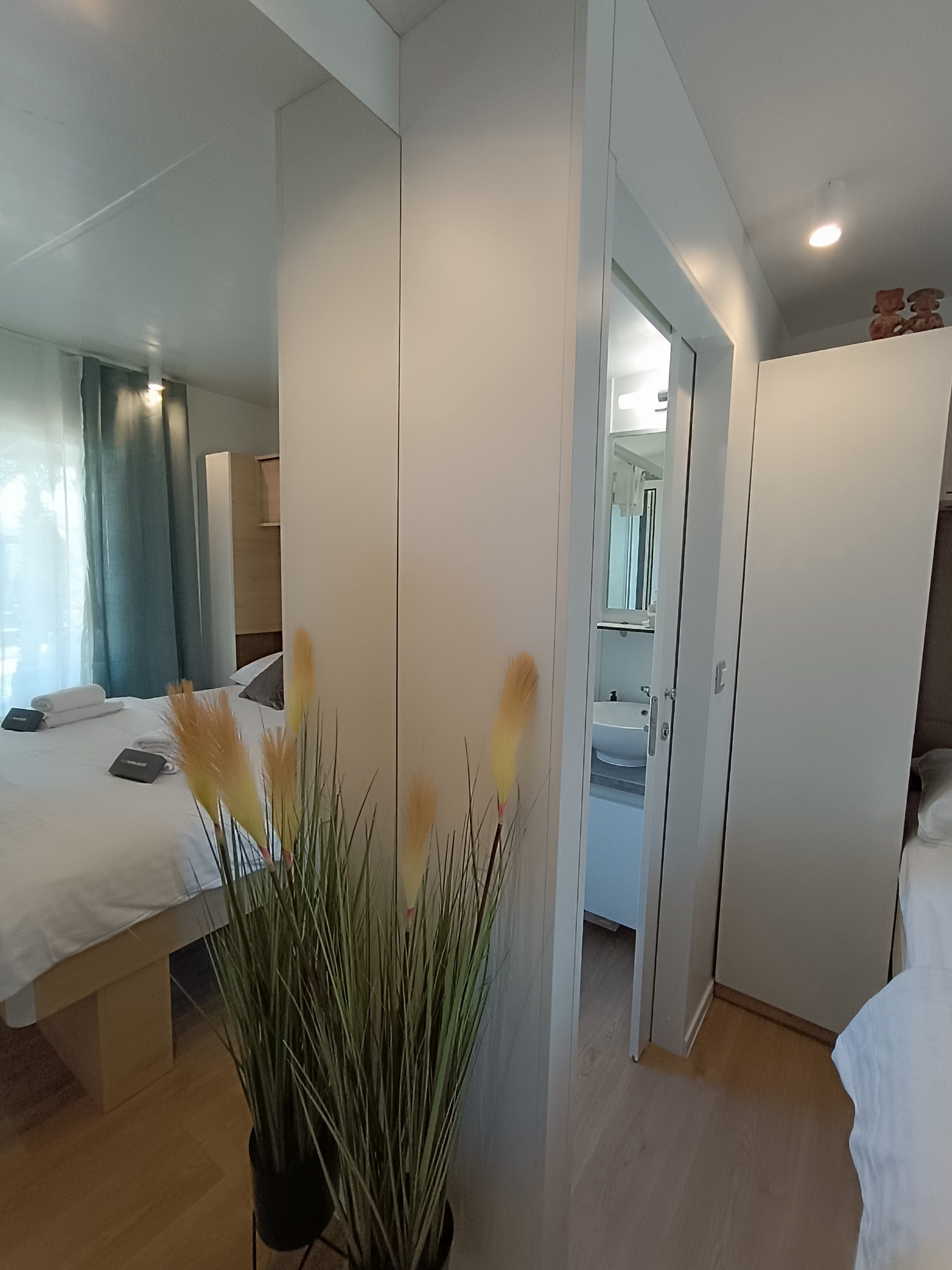 Evening view of a stylishly lit terrace with curtains and tropical plants at Zen Zone holiday home in Croatia